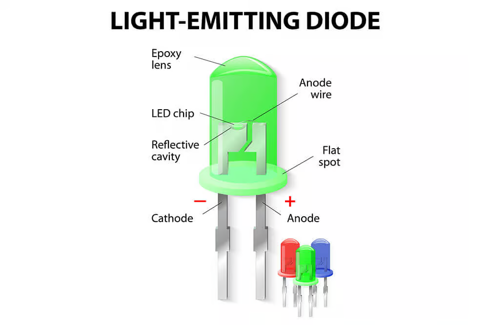 - LED (Light Emitting Diode) มี 2 ขา: Anode (ขั้วบวก, ขา +, ขายาว) และ Cathode (ขั้วลบ, ขา -, ขาสั้น)