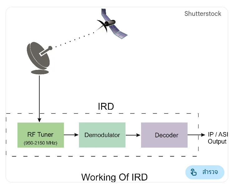 - ในที่สุด สัญญาณที่ถอดรหัสแล้วจะถูกส่งออกจาก IRD ในรูปแบบมาตรฐาน แผนภาพแสดงเอาต์พุต IP (Internet Protocol) หรือ ASI (Asynchronous Serial Interface) ซึ่งมักใช้ในสภาพแวดล้อมการออกอากาศระดับมืออาชีพเพื่อการประมวลผลหรือการเผยแพร่เพิ่มเติม สำหรับอุปกรณ์สำหรับผู้บริโภค เอาต์พุตนี้อาจเป็น HDMI สำหรับการเชื่อมต่อโดยตรงกับโทรทัศน์