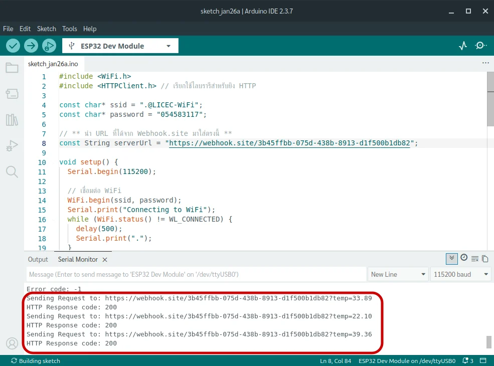 เราจะเขียนโปรแกรมให้ ESP32 เชื่อมต่อ WiFi แล้วส่งค่าตัวเลขสุ่ม (จำลองเป็นอุณหภูมิ) ไปที่ Webhook.site ทุกๆ 5 วินาที