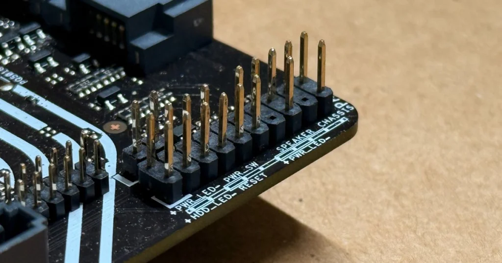 - เทคนิคการต่อ: ให้สังเกตเครื่องหมาย “+” (บวก) หรือ “สามเหลี่ยมเล็กๆ” ที่หัวปลั๊ก ซึ่งหมายถึงขั้วบวกเสมอ และต้องดูคู่มือเมนบอร์ดประกอบ (หรือดูตัวอักษรเล็กๆ บนบอร์ดที่เขียนว่า JFP1 หรือ PANEL)