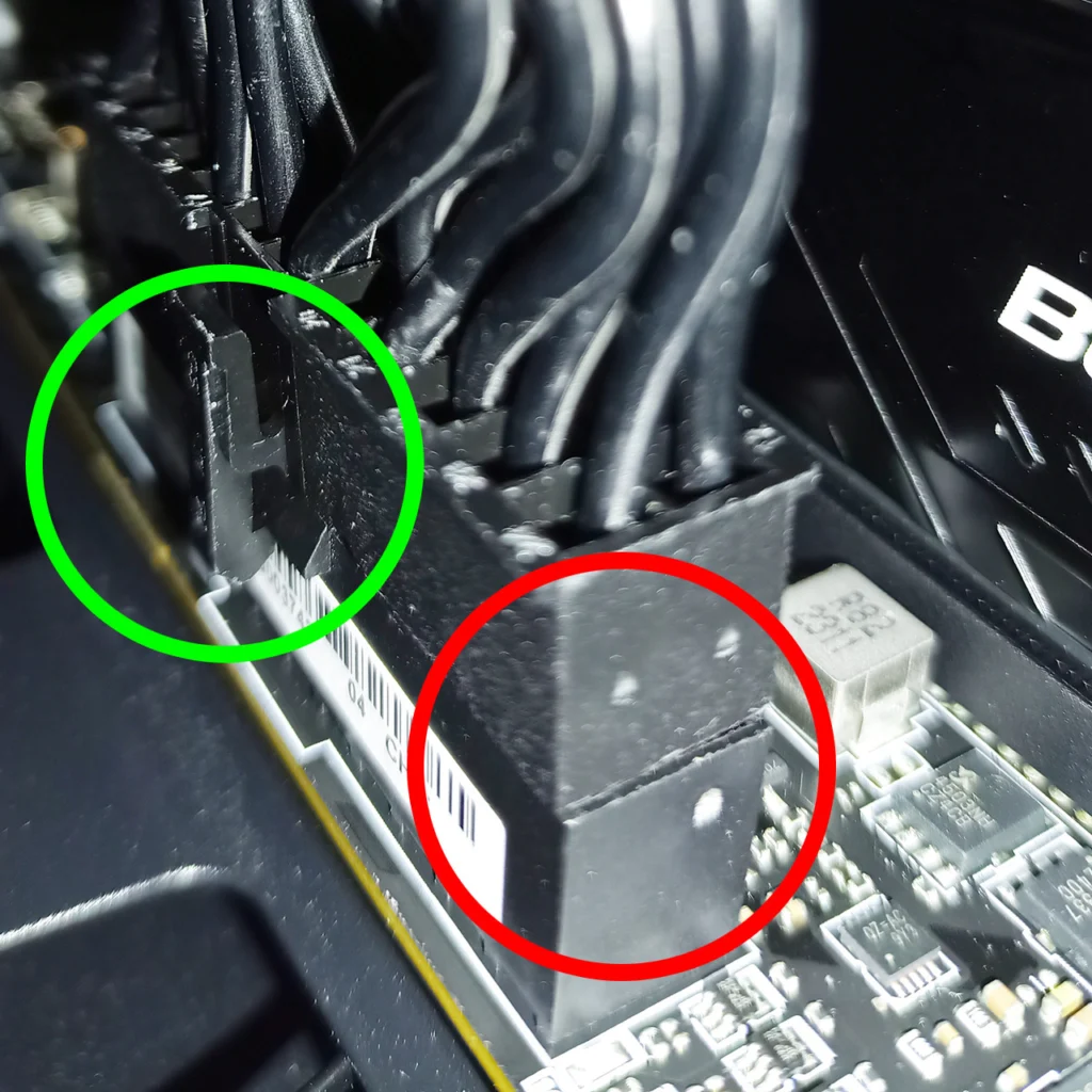 1. Main Power (24-pin): สายเส้นใหญ่ที่สุด จ่ายไฟให้เมนบอร์ด ต้องกดให้เขี้ยวล็อกดัง “คลิก”
