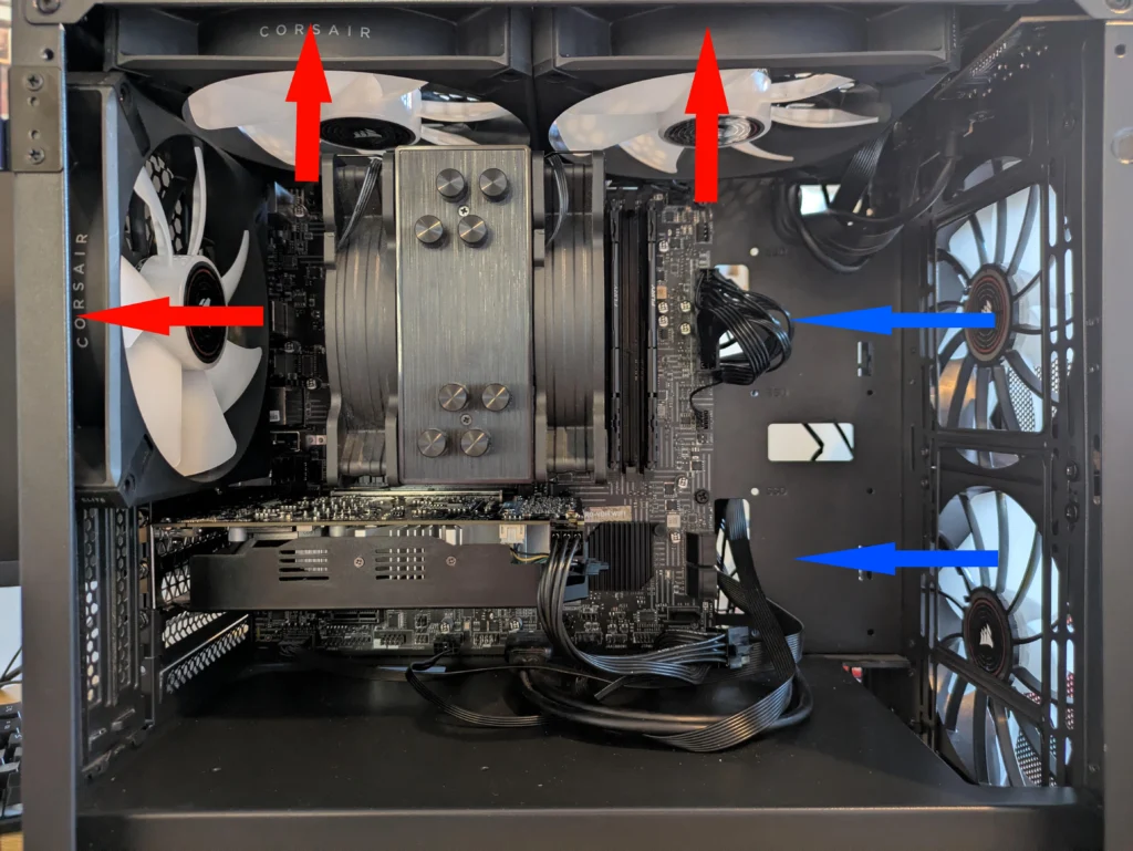 - Case Fans: นำสายพัดลมเคสไปเสียบที่ช่อง SYS_FAN หรือ CHA_FAN บนเมนบอร์ด เพื่อให้ระบบสามารถควบคุมความเร็วรอบพัดลมตามอุณหภูมิได้