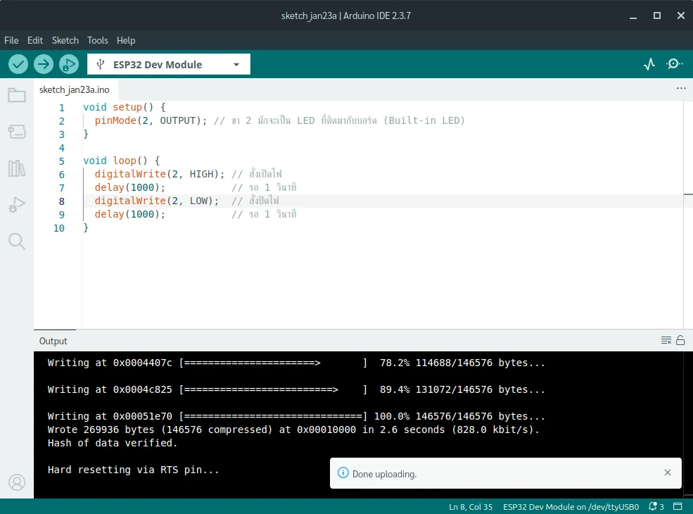 5. ถ้าสำเร็จ ด้านล่างจะขึ้นว่า “Done uploading” และไฟสีฟ้าบนบอร์ดจะกระพริบครับ!